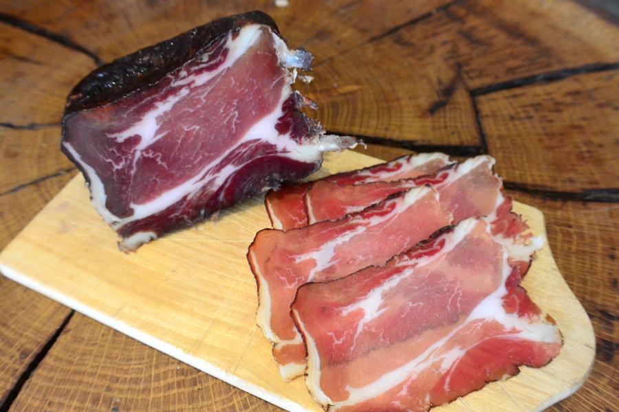 Dieser Almspeck ist ein Schopfspeck (Nacken) und zeichnet sich durch sein zartes Fleisch ohne Schwarte aus.